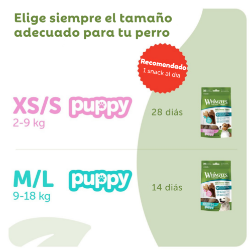 ¡Mantén la salud dental de tu cachorro bajo control con los Snacks Dentales WHIMZEES® Puppy! Estas recompensas beneficiosas ayudan a remover la acumulación de placa y sarro mientras tu amigo peludo favorito mastica hasta el fondo. Y como están especialmente diseñadas solo para cachorros, son más suaves que nuestros WHIMZEES® Stix para adultos. ¡Son 100% naturales, sin ingredientes OGM, sin cereales ni gluten, para que los cachorros sensibles también las puedan disfrutar! Estos WHIMZEES® vienen disponibles en dos formatos y tamaños que a tu cachorro le encantarán, para que puedas elegir la mejor recompensa para tu pequeño compañero.